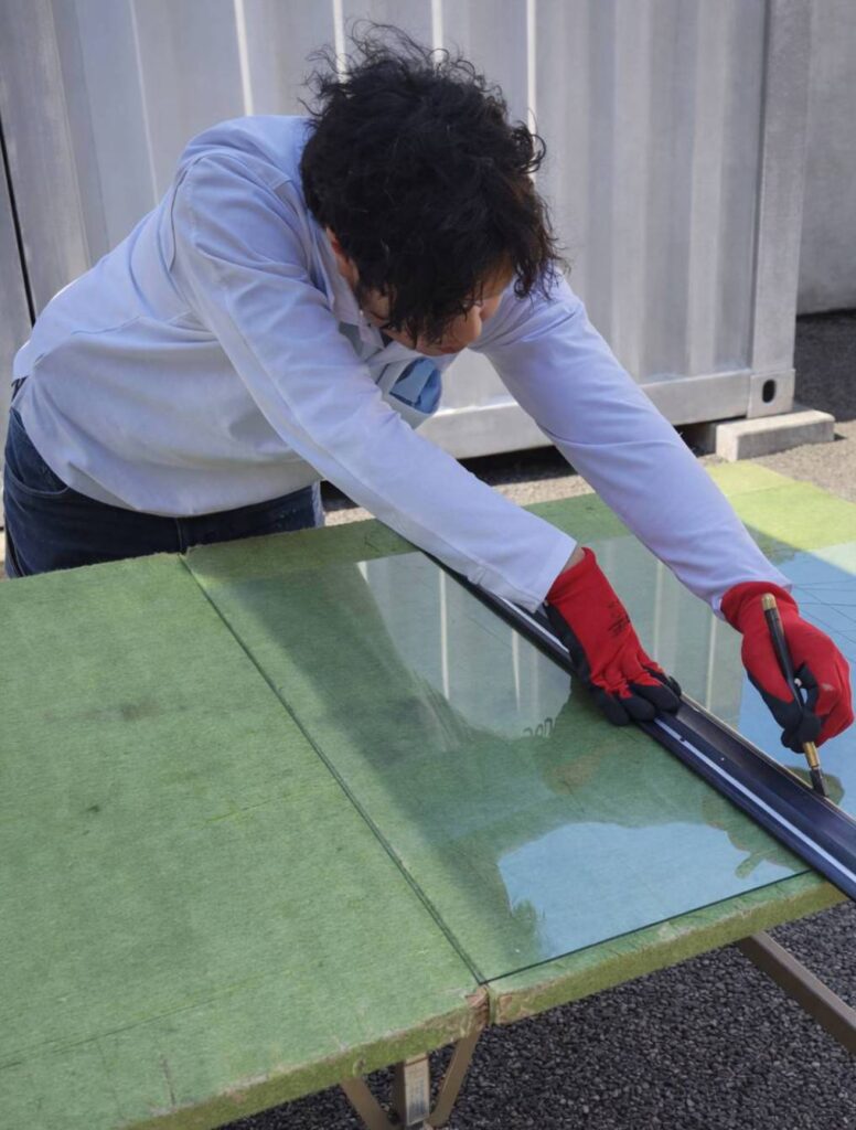 当店はガラス運搬専用に作り替えた作業車に、各種ガラス在庫・作業台・ガラスカット工具を積載しています。現場でサイズに合わせてカットできるケースも多く、スピーディーな窓ガラス修理・ガラス交換が可能です。