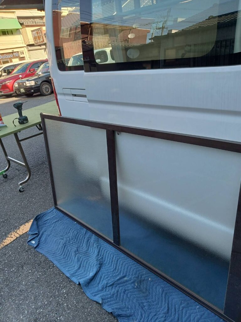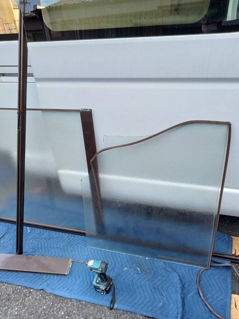 新しい型板ガラスを寸法に合わせてカットし、既存サッシへ組み込みました。