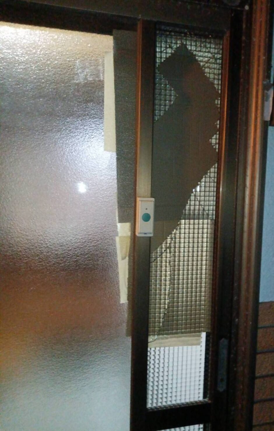 夜間の玄関引戸ガラス交換作業(下関市安岡町)