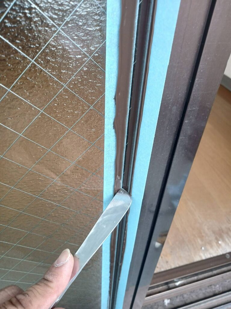 コーキング色は既存サッシの色に合わせて選定します。施工時はガラスの両面と枠側にマスキングテープを貼り、隙間へシリコーン材を充填していきます。