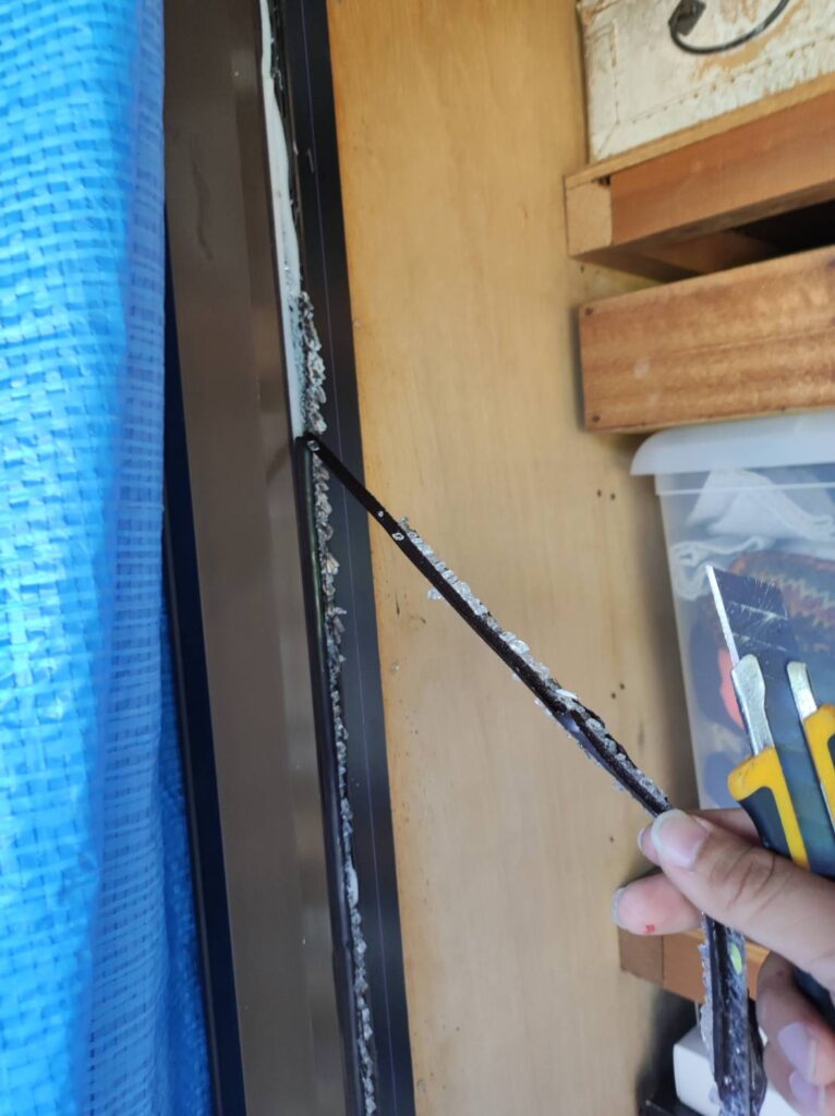 まずはコーキングをカットし、枠に残ったガラス片を取り除いていきます。